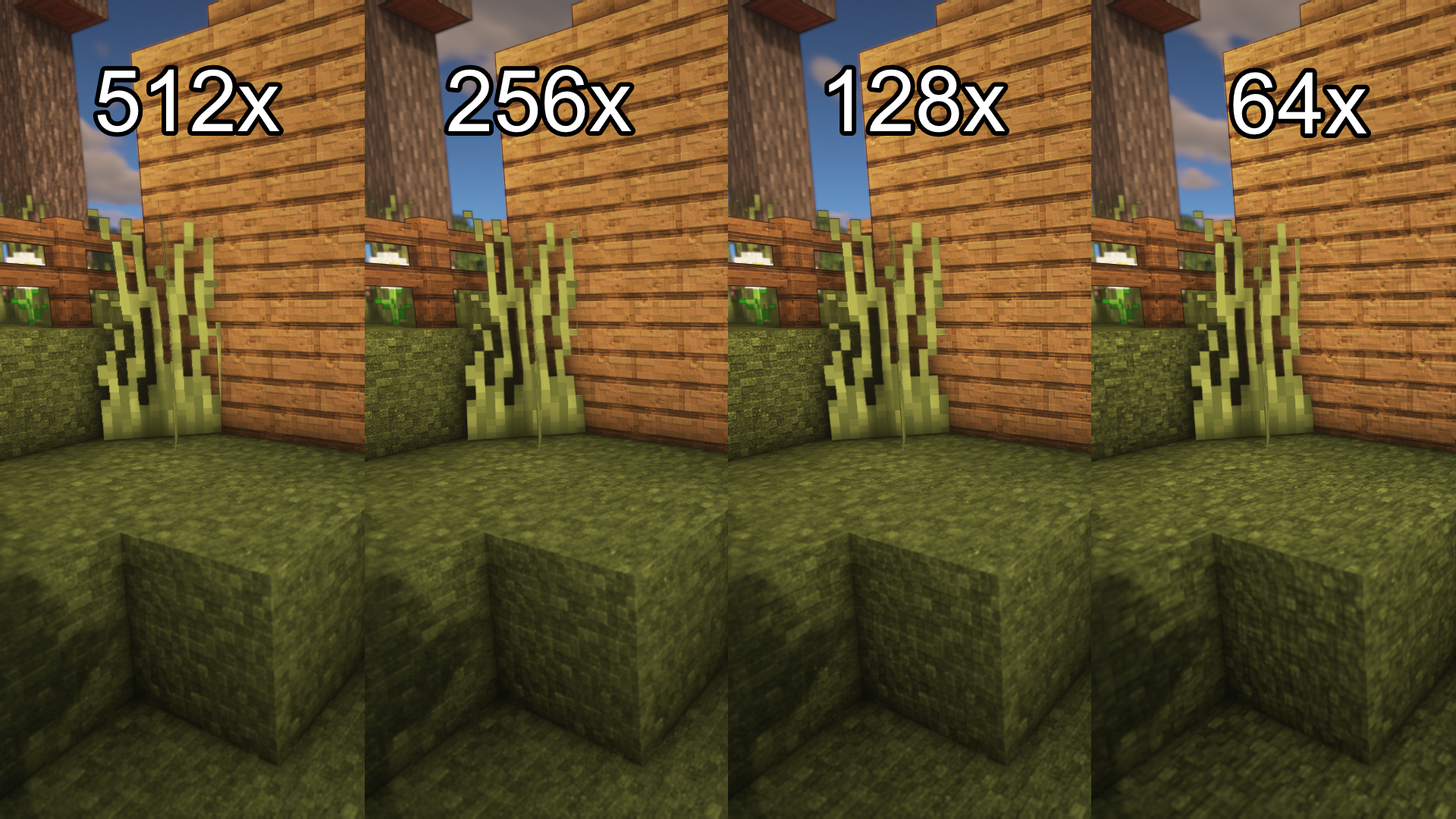 I decided to play around with some values regarding filters and unsharp masks to generate the lower-res versions of Vanillaccurate. The goal was to improve the appearance of the downscaled packs, retaining detail but avoiding too much noise. I think I found a really good balance, and packs down to 128x look identical from a distance !