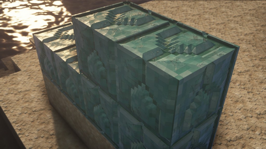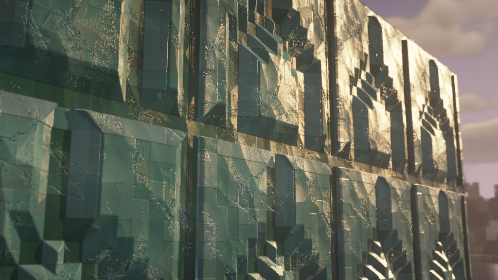 Here are the next prismarine-related blocks. Prismarine bricks have a nice geometric flair to them. I tried bringing that pattern out by using beveled normalmap and heightmap. Turns out pretty detailed that way, tell me what you think 😉