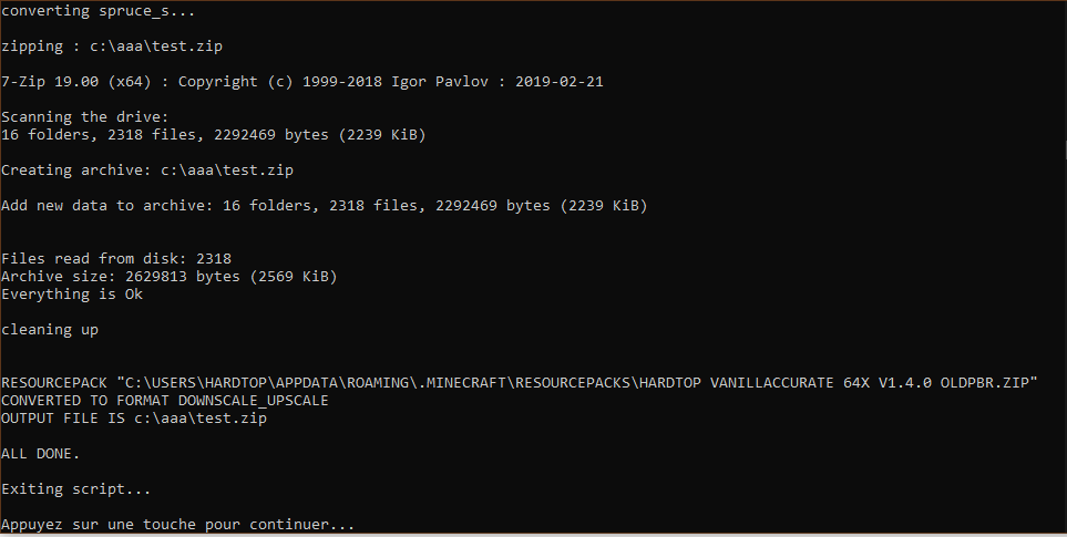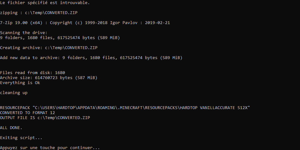 - The script will display lines of text, some might seem like errors but don’t worry. When converting the script might expect some files to convert but some packs might be incomplete and lack some of those files, thus giving out an error. The output pack will still work.