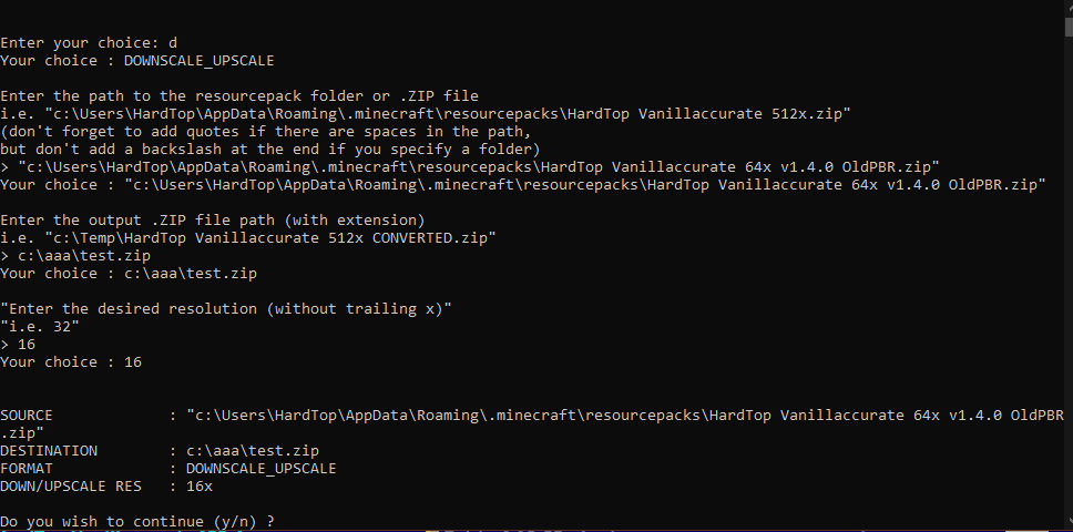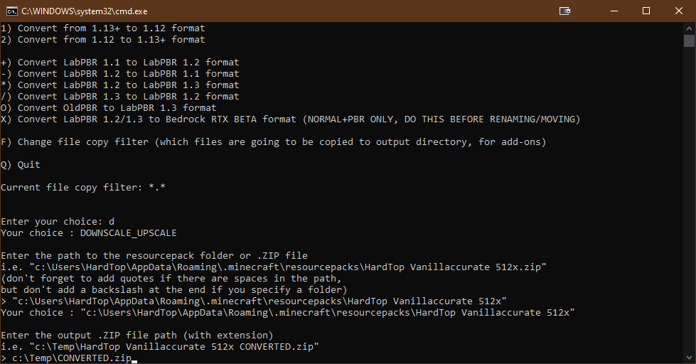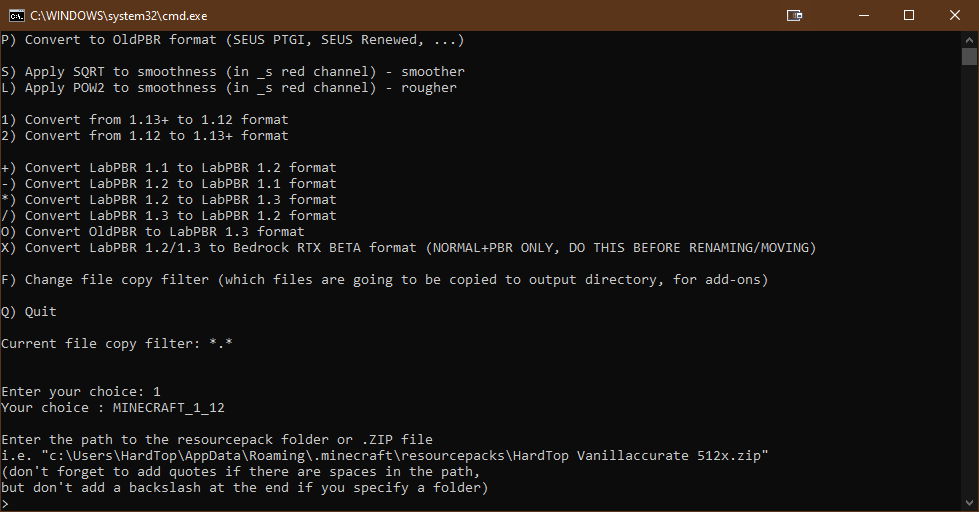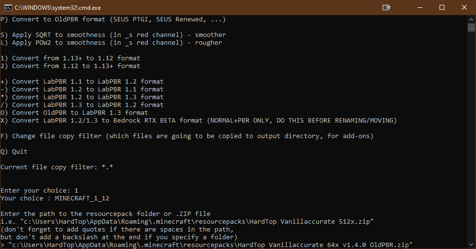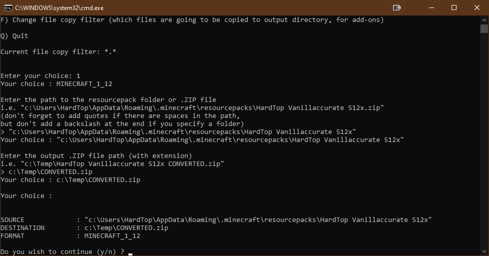 - You’ll now be asked to enter the path to the resource pack you wish to convert. This resource pack can be a .ZIP file or a folder containing the files (both are recognized by Minecraft). Please note if the path contains spaces, you are required to add quotes (“) around the path.