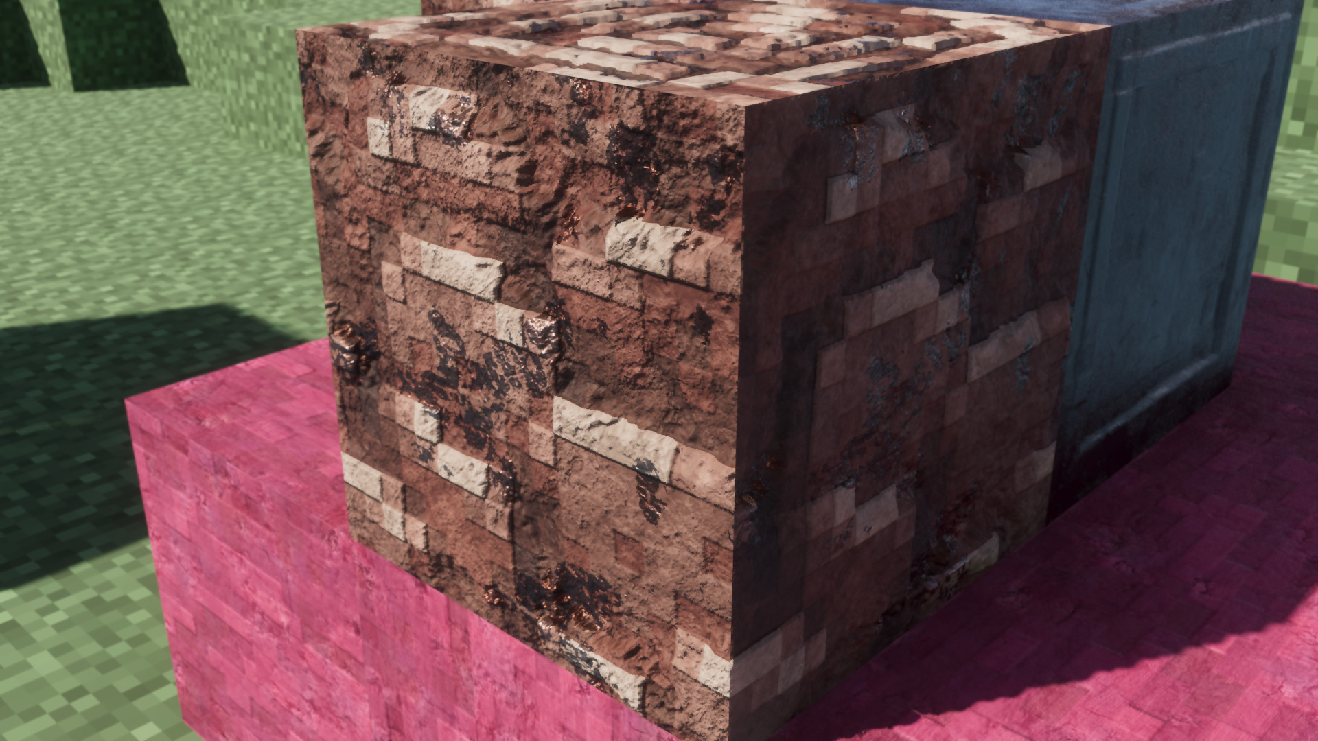 Ancient debris (side & top) I designed as rocky concretions with metallic inserts and a scale-like POM pattern to roughly follow the overall style of the original block. Metallic inserts are there to represent the netherite ore that can be extracted from those blocks.