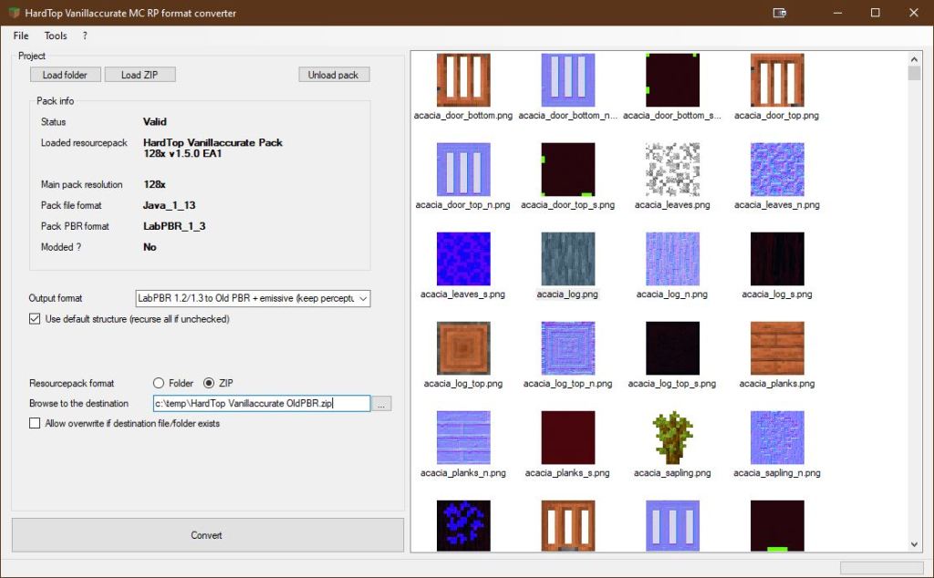 - conversions from/to any MC version (Java 1.8, Java 1.13, Bedrock, …) and from/to any PBR version (OldPBR, LabPBR 1.3, OldPBR+emissive, possibly grayscale…)