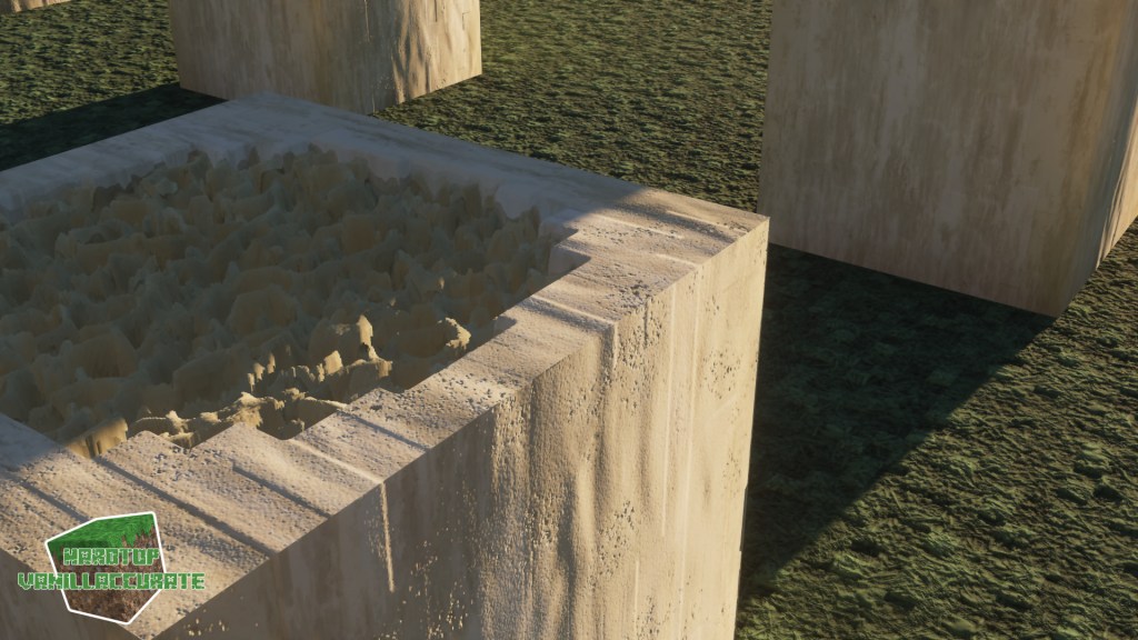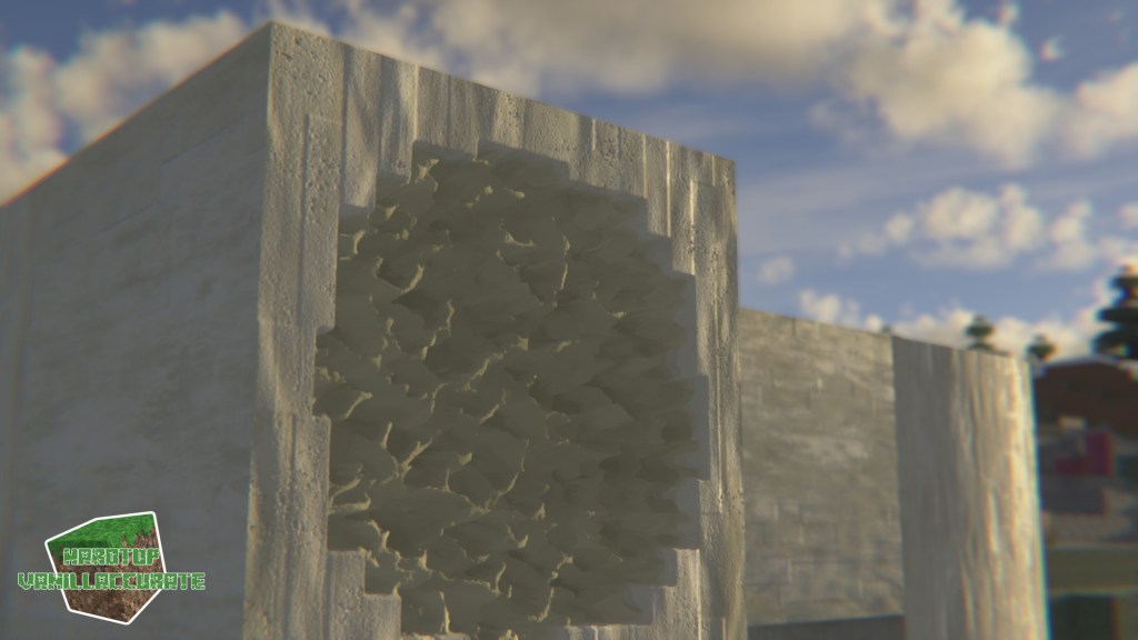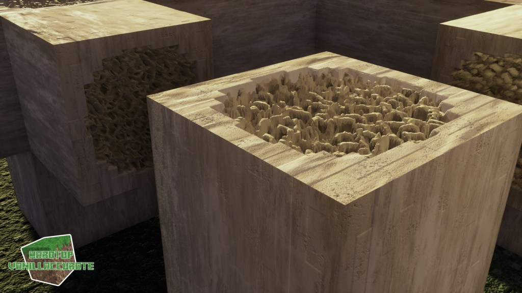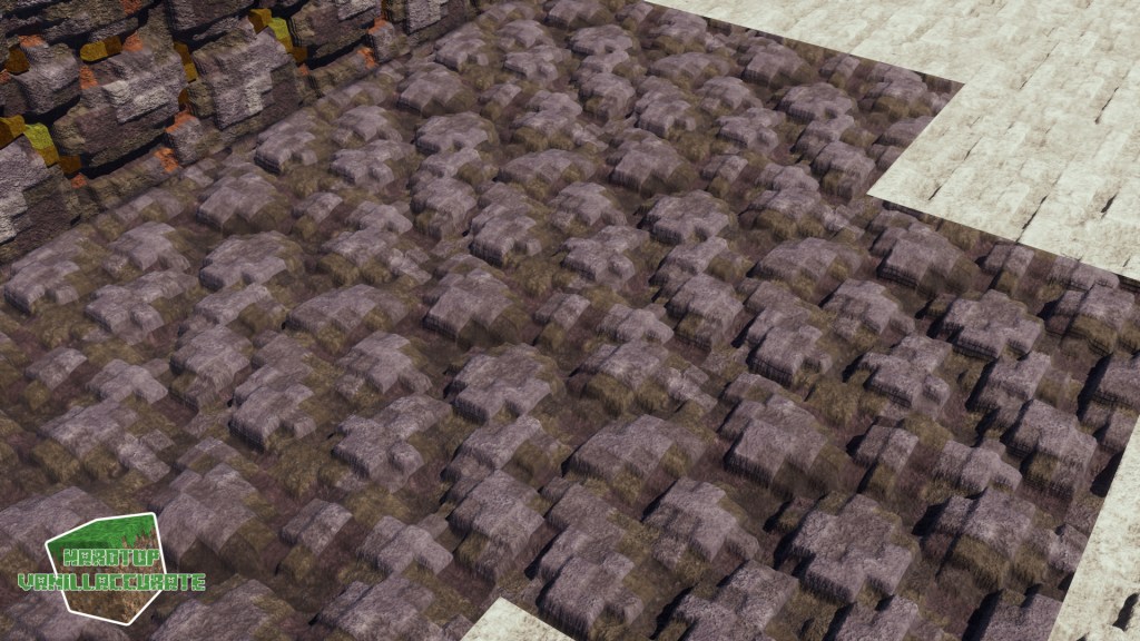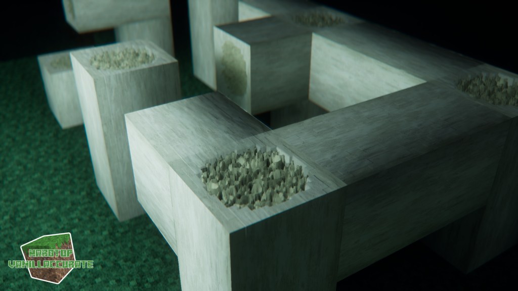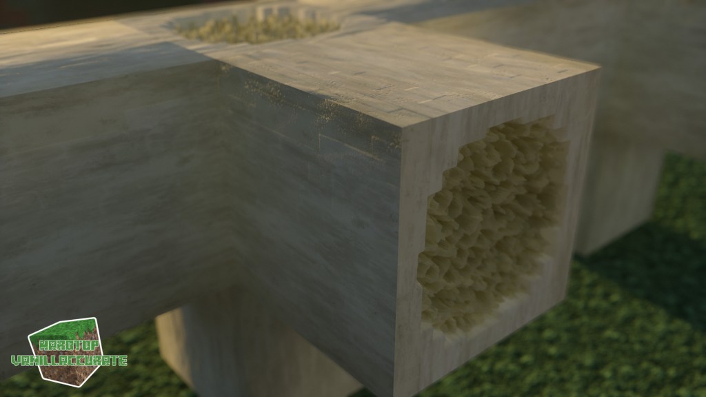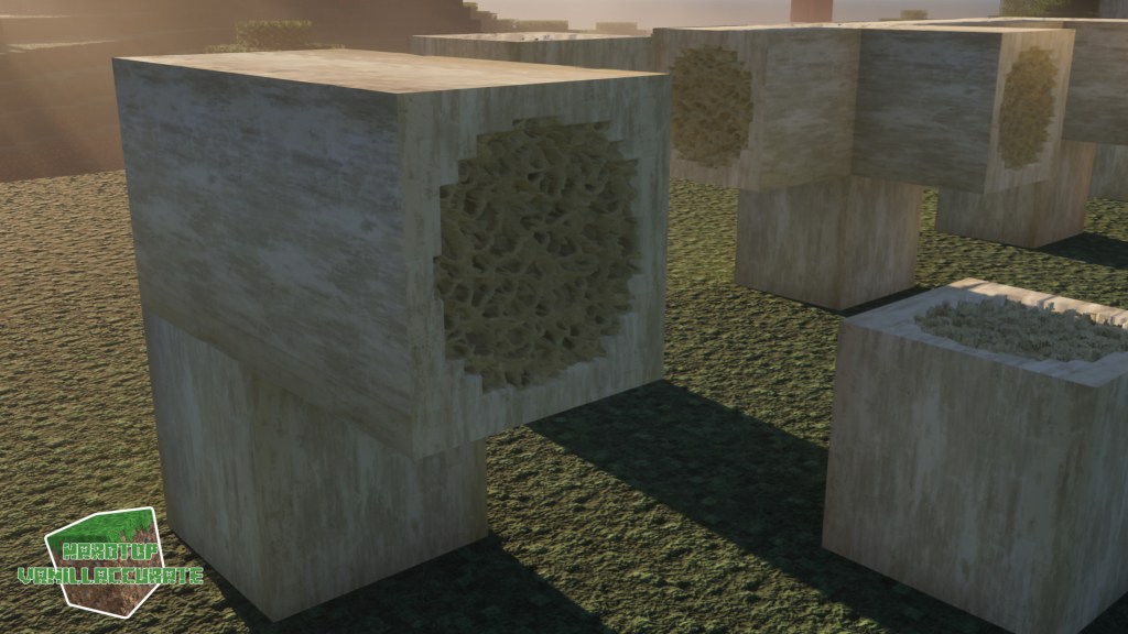I also changed how bones are generated, improving some details and redesigning the shape to minimize POM artifacts. I added roundness to the side blocks, and lots of AO with deeper heightmap for the marrow parts. Again, most world-space PT shaders were used for night shots.