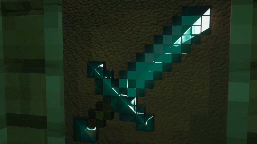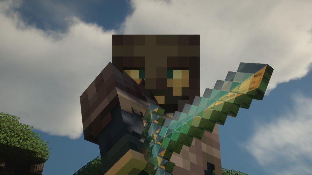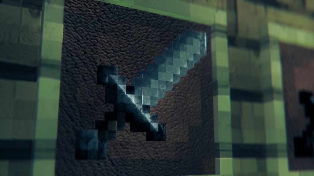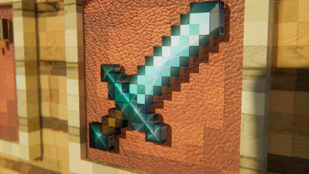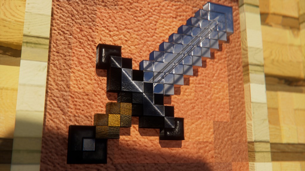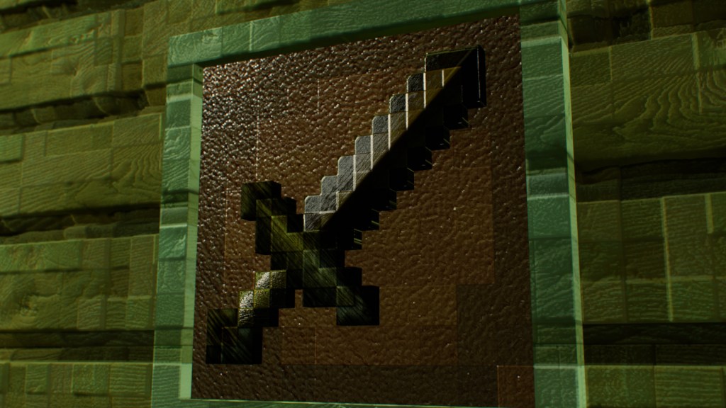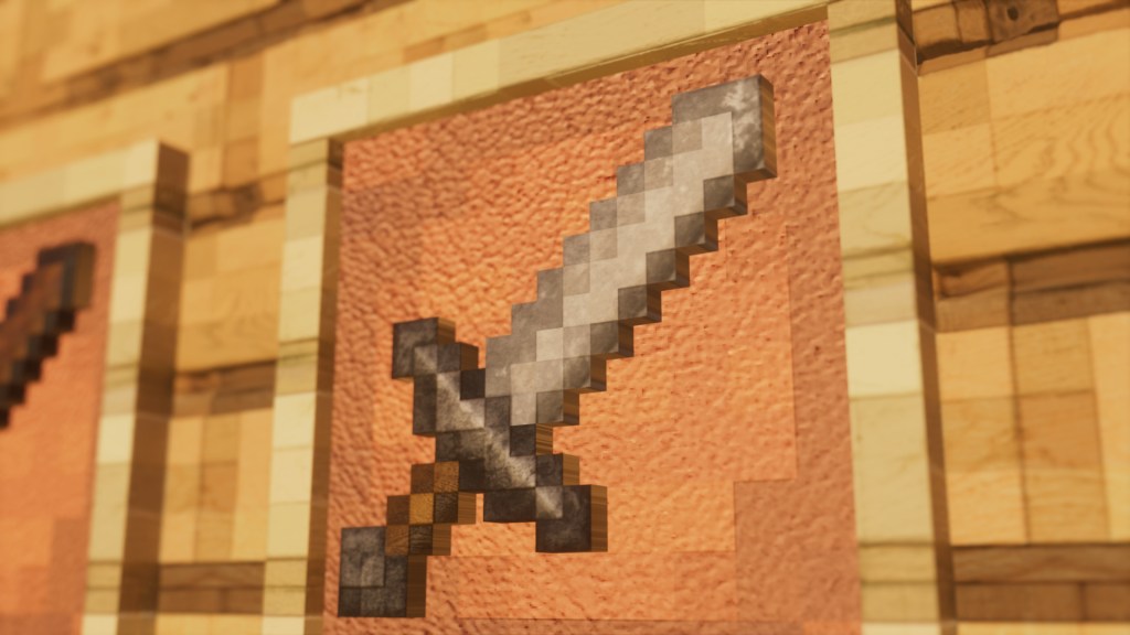 This one was the first I re-designed. It serves as a baseline for all other swords. You can see I used some scratches and a dull sheen on the blade (yeah it’s somewhat of an oxymoron, bear with me). LabPBR-wise the blade uses hardcoded iron, whereas pommel, finials and crossguard use albedo-metal, this means that the results can vary a tiny bit from one shaderpack to the other as far as the blade is involved. Nothing major at all though.