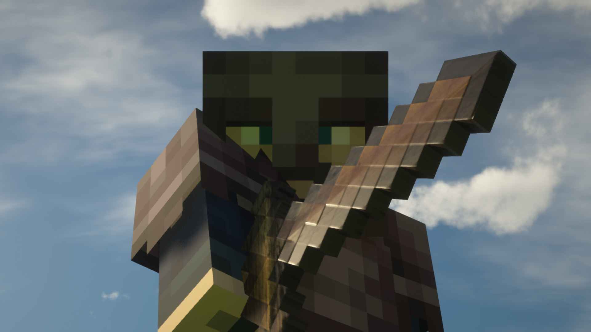 This one was the first I re-designed. It serves as a baseline for all other swords. You can see I used some scratches and a dull sheen on the blade (yeah it’s somewhat of an oxymoron, bear with me). LabPBR-wise the blade uses hardcoded iron, whereas pommel, finials and crossguard use albedo-metal, this means that the results can vary a tiny bit from one shaderpack to the other as far as the blade is involved. Nothing major at all though.