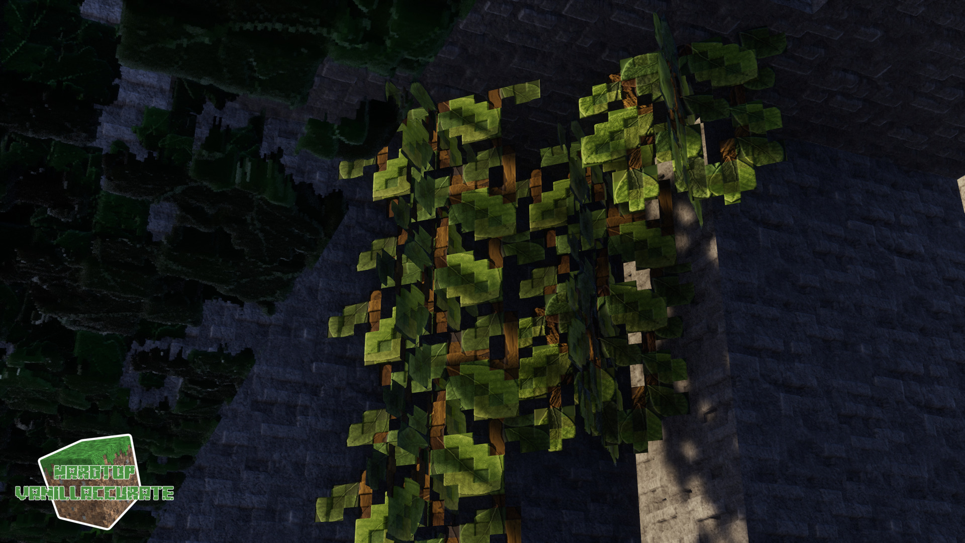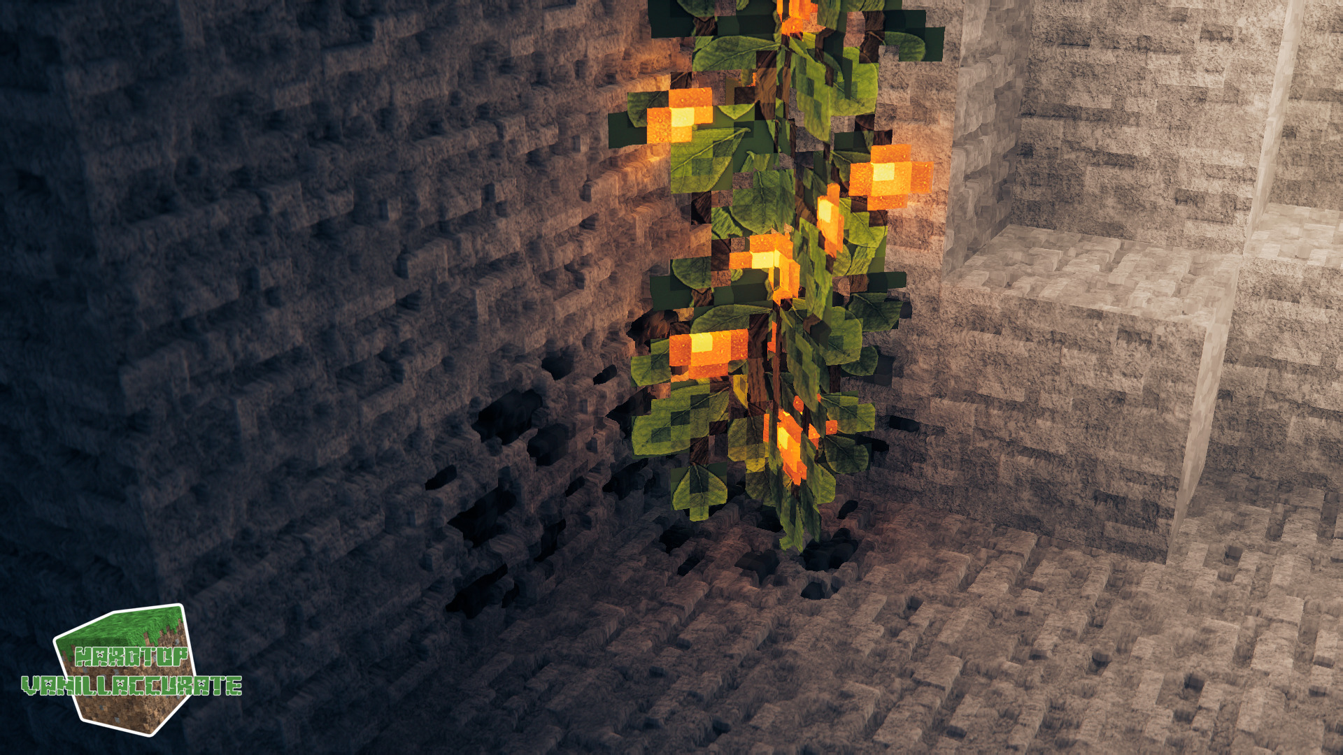 I managed to display those vines in-game, here are some nice screenshots of those new blocks that provide light as well as sustenance. The previous in-game shot I shared was tinted and using the regular vine model. As it turns out the original vanilla model for such blocks is supposed to be a hanging “cross” model like weeping vines.